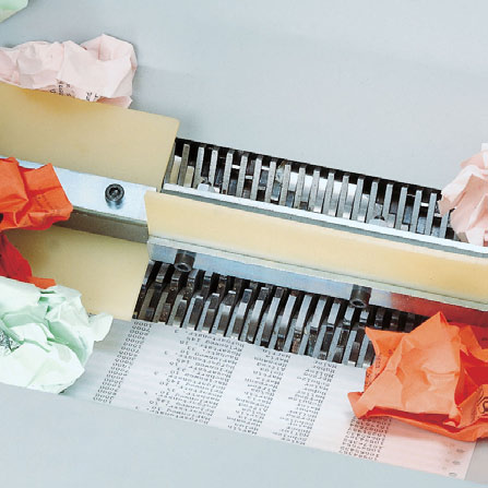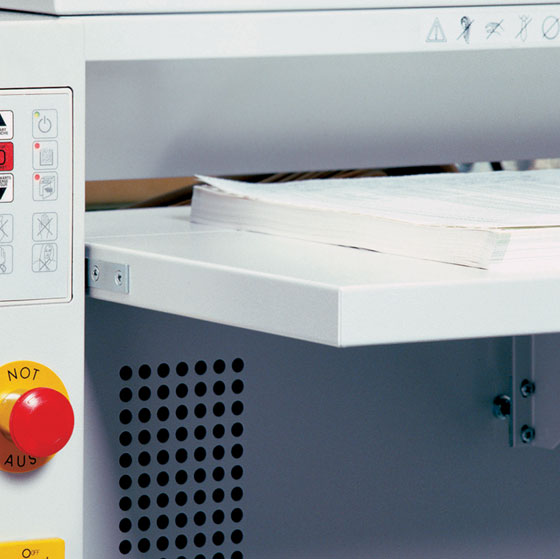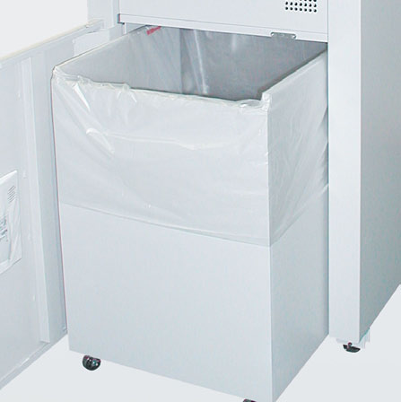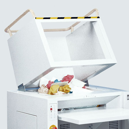 Tilting feeding hopper for crumpled paper. Feeding paddle for effective insertion of crumpled paper into the cutting head. Second feed open ing (460 mm) located under the hopper for flat paper and computer printouts with automatic start/stop via a photo cell. Fold-away feeding table. Main switch and emergency cut-off switch. Electronically controlled automatic reverse and power cut-off in case of overfeeding. Soft touch keys for forward (continuous operation), stop and reverse. Optical indicators for the operational status of the machine. Robust shredding heads with special hardened cutting shafts made of high-quality steel, resistant against soft metal objects. Powerful three phase motor with thermal motor protection. Front door and mobile shred bin for easy removal of the full shred bag. High volume container for the shredded material. Automatic stop when hopper or front door is opened, or when the shred bin is full. Mobile on castors. Two years guarantee on the cutting tools.