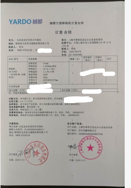 海南三亞農(nóng)商銀行李鵬輝同志與越都碎紙機(jī)簽訂合同,訂購(gòu)越都專業(yè)碎卡機(jī)產(chǎn)品