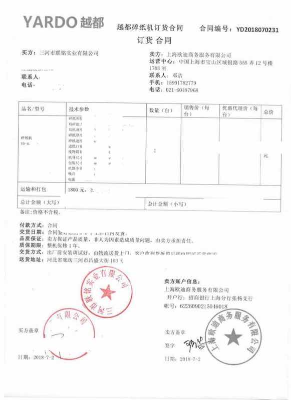 【河北省越都工業(yè)碎紙機(jī)案例】【三河市大型工業(yè)碎紙機(jī)】河北省三河市聯(lián)銘實(shí)業(yè)有限公司與上海歐迪簽訂協(xié)議,訂貨越都大型工業(yè)碎紙機(jī)產(chǎn)品,用于粉碎單位涉密文件、憑證和圖紙!
