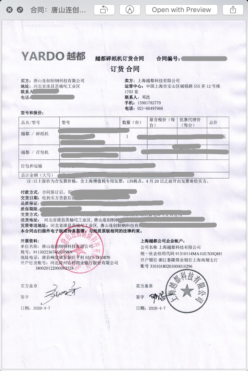 河北省唐山灤縣碎紙機用戶案例:河北省唐山灤縣連創(chuàng)制鋼科技有限公司張總訂購越都涉密粉碎銷毀用碎紙打包一體機產(chǎn)品(粉碎打包一體機)